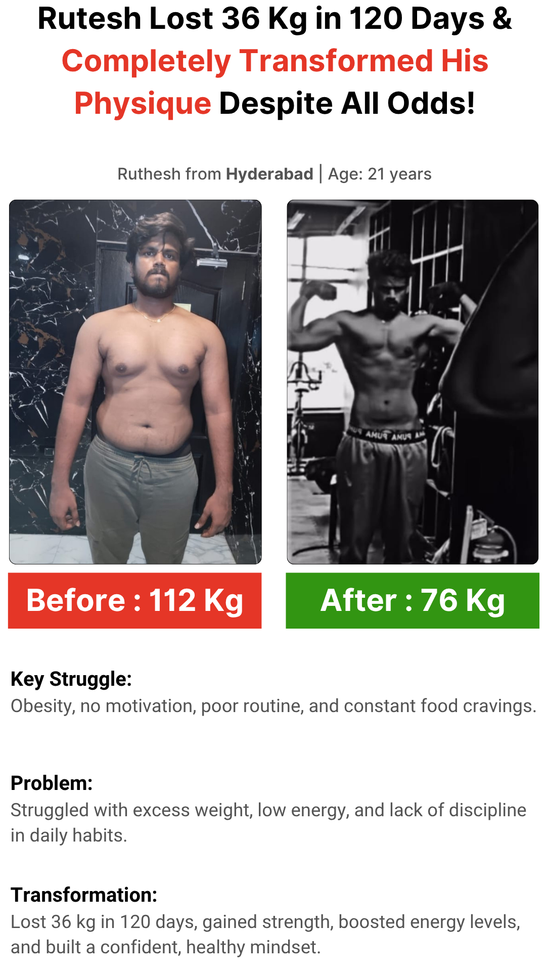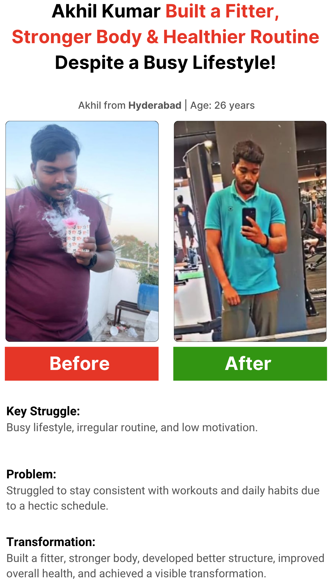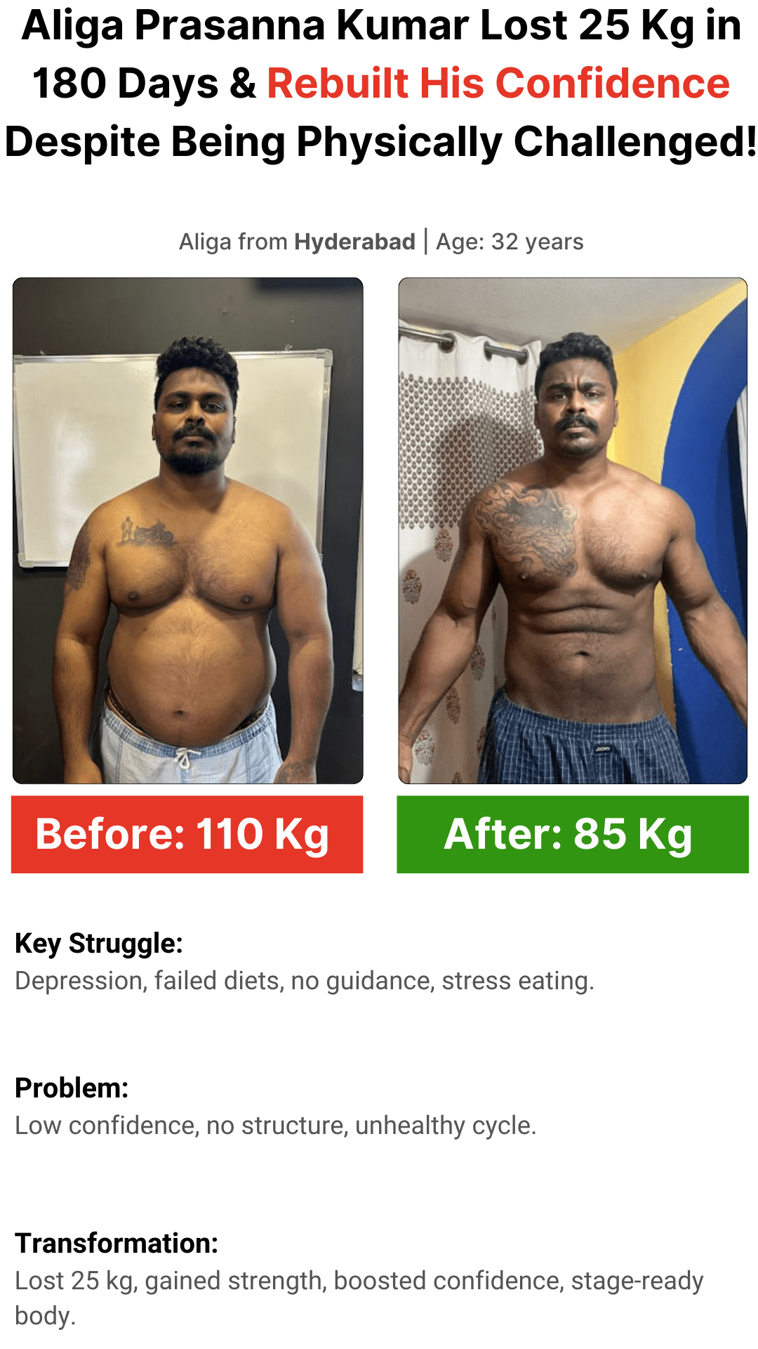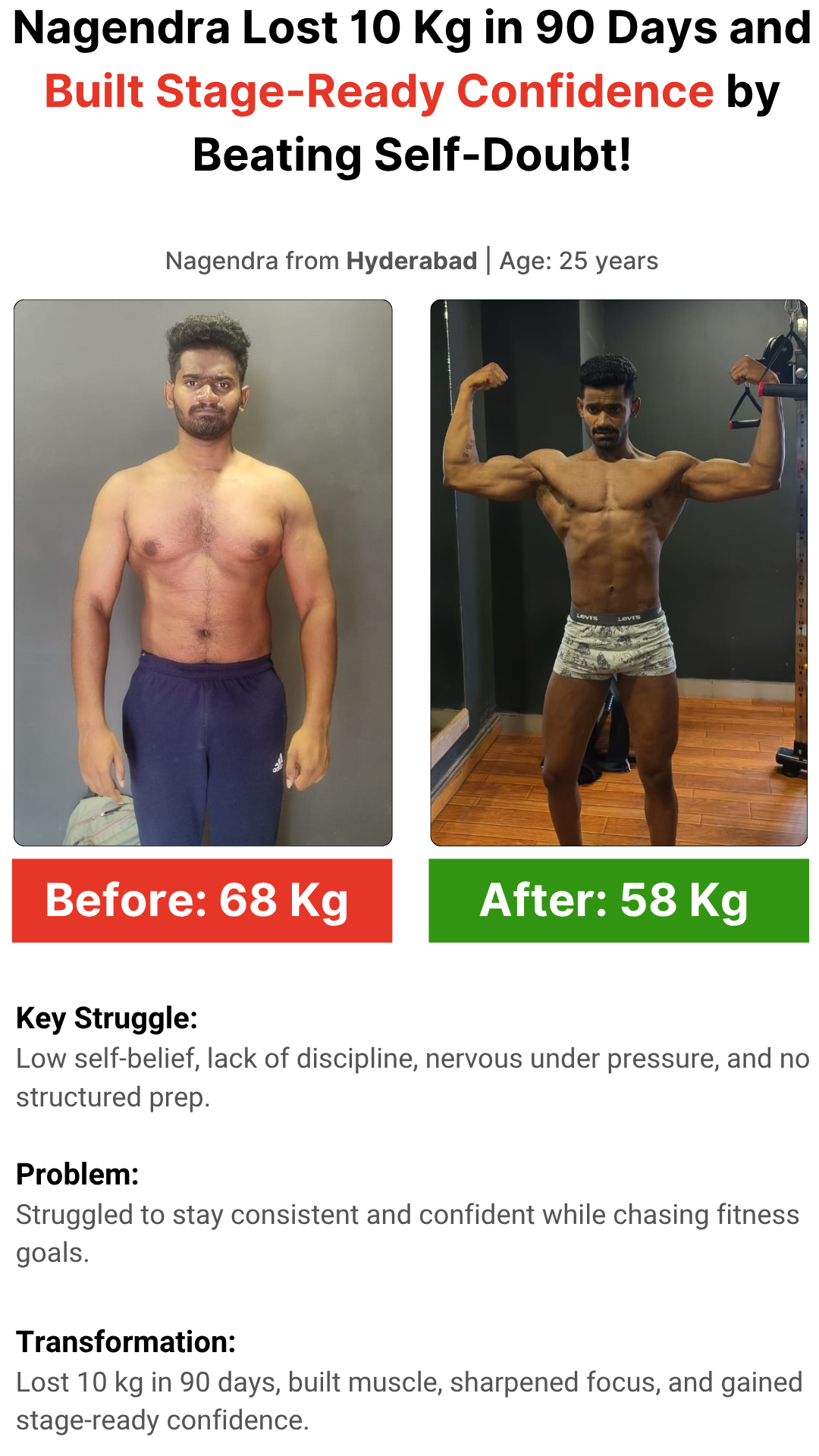 I help Telugu working professionals & entrepreneurs lose belly fat, build a lean aesthetic body, and boost energy using my T.E.L.U.G.U.™ Transformation Framework — even with long work hours, stress, and irregular routines.